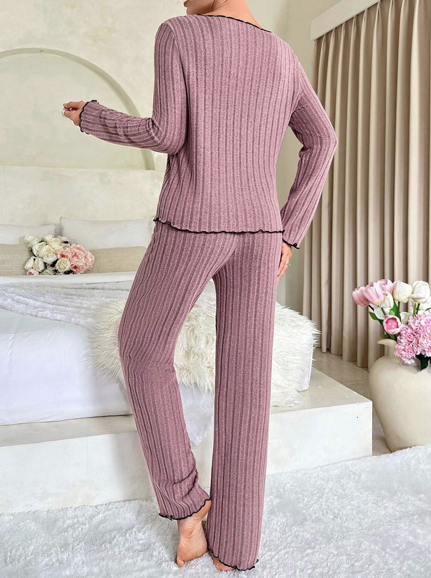 Indulge in the serene charm of our Rosy Lettuce Trim Lounge Set. This exquisite set features a soft, rosy hue with delicate black lettuce trim detailing, adding a touch of whimsical elegance to your loungewear collection. Crafted from a lightweight and breathable fabric, the set offers both comfort and style, perfect for relaxing at home or enjoying leisurely moments.
