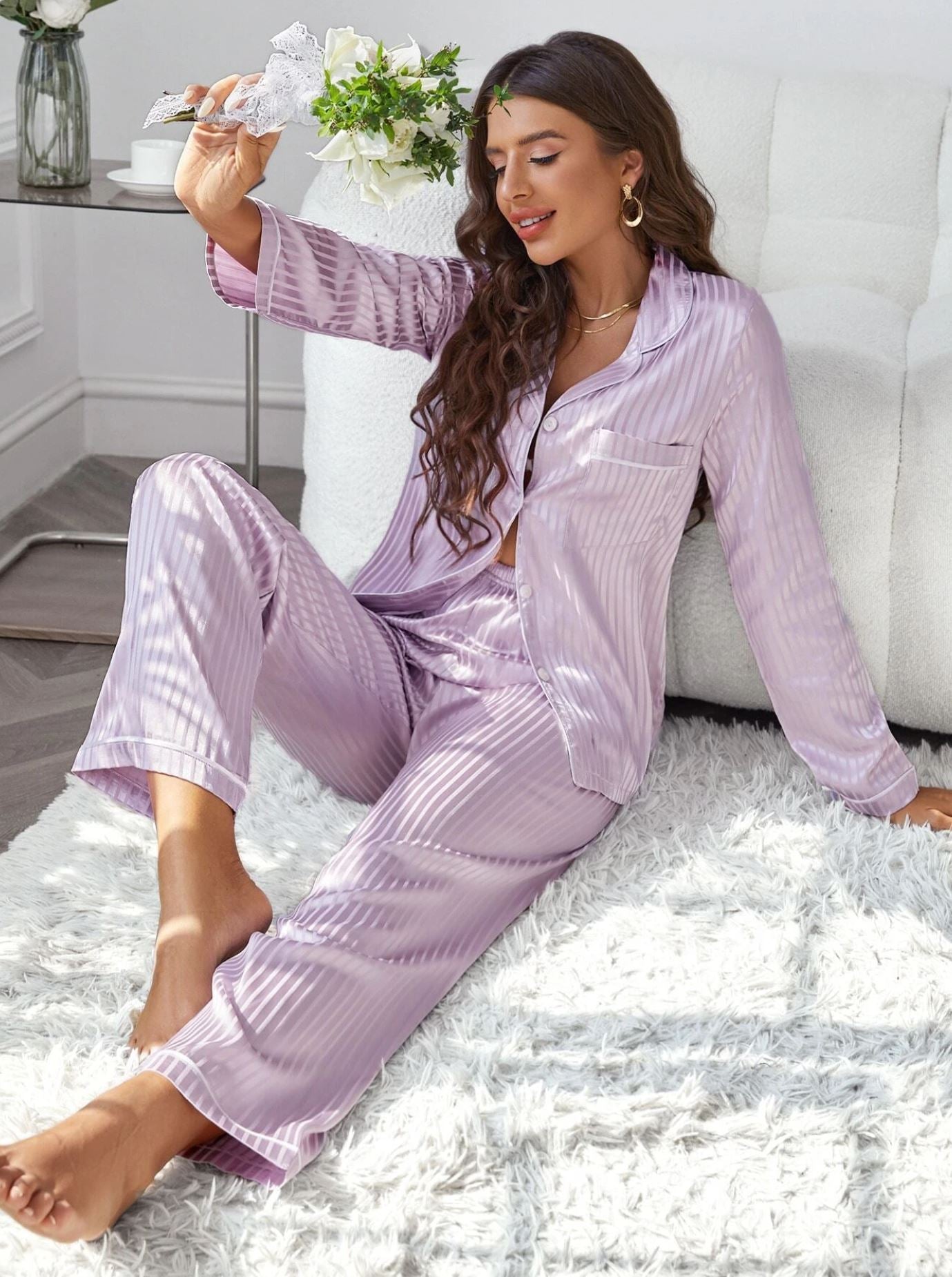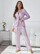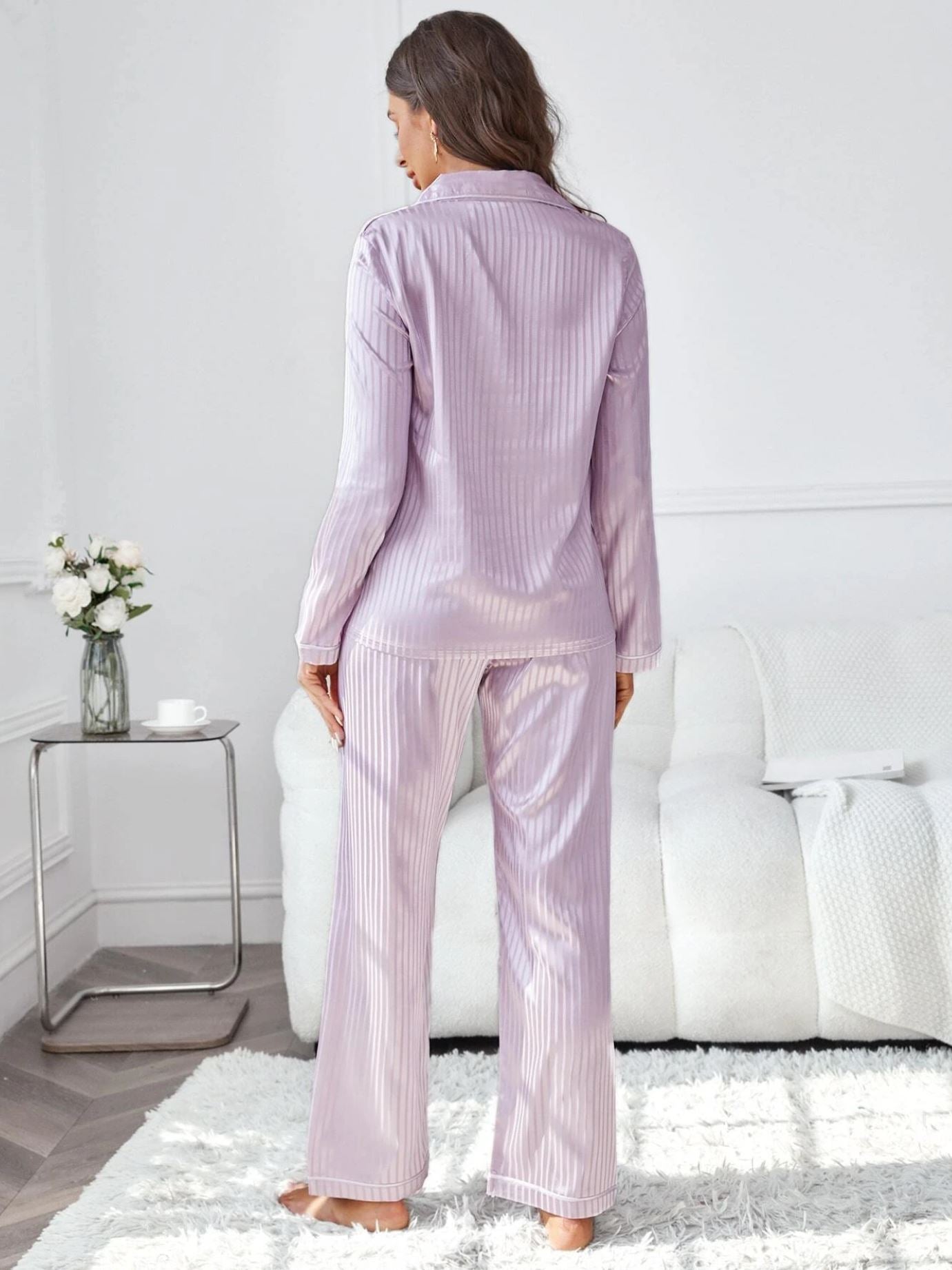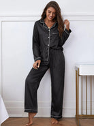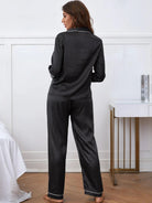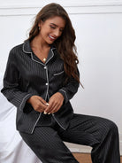 Striped Pocket Front Contrast Piping Satin PJ Set